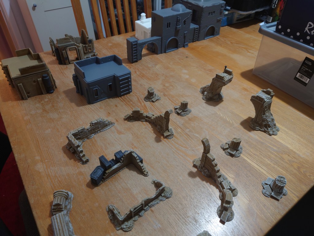 A slow burn, but the intent is to be able to play Legion over a board representing two iconic locations, with appropriate forces – desert and ice. On the desert front, I’ve been printing some of the absolutely excellent Pilgrim City and Desert buildings from Steve O’Boyle at Corvus Games Terrain to add to the existing collection of desert terrain, which is mostly made up of pre-painted rocks from Gamemat.eu.