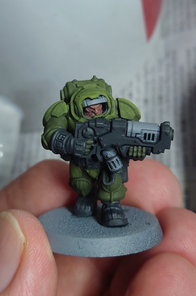 A quick colour test I started on. Still need to define some of the details like the knee and elbow pads and the bits of the gun I’ve not yet touched, but this took probably a grand total of 30 minutes to do with four paints.