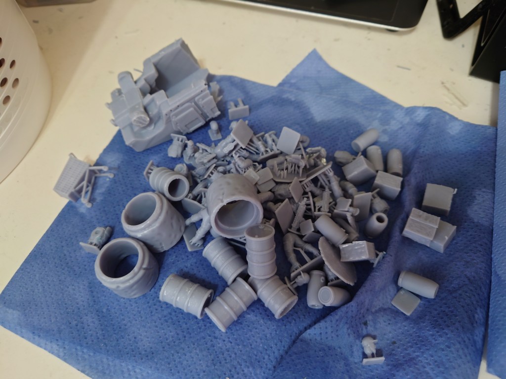 Current state above. The roofs, doors and other fittings will all be a different grey, and when assembled they’ll provide some nice options for the table. The next task for these will be to add bases and some scatter to bring them to life, hence this lot off the 3d printer: